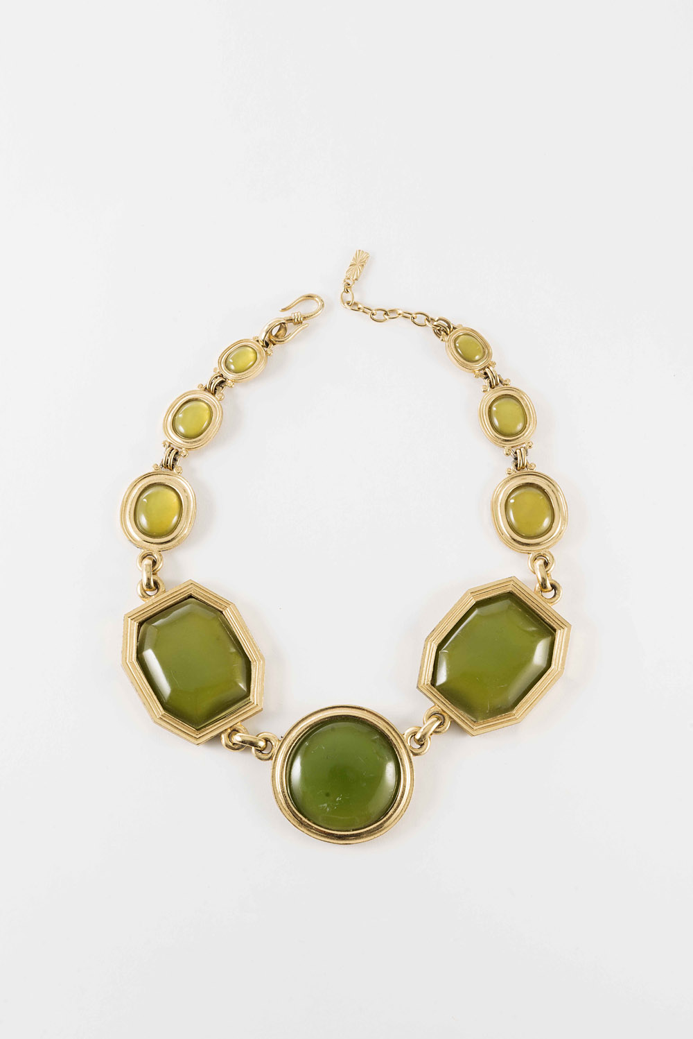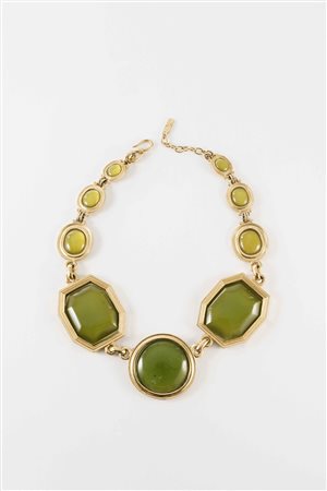 Yves Saint Laurent: collana degradata a ovali, ottagoni e tondi, con paste vitree verde oliva, lungh. cm 58