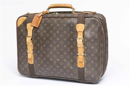 Louis Vuitton Paris: piccola valigia in tela Monogram, rifiniture in vacchetta e tasca esterna, largh. cm 52 (difetti)