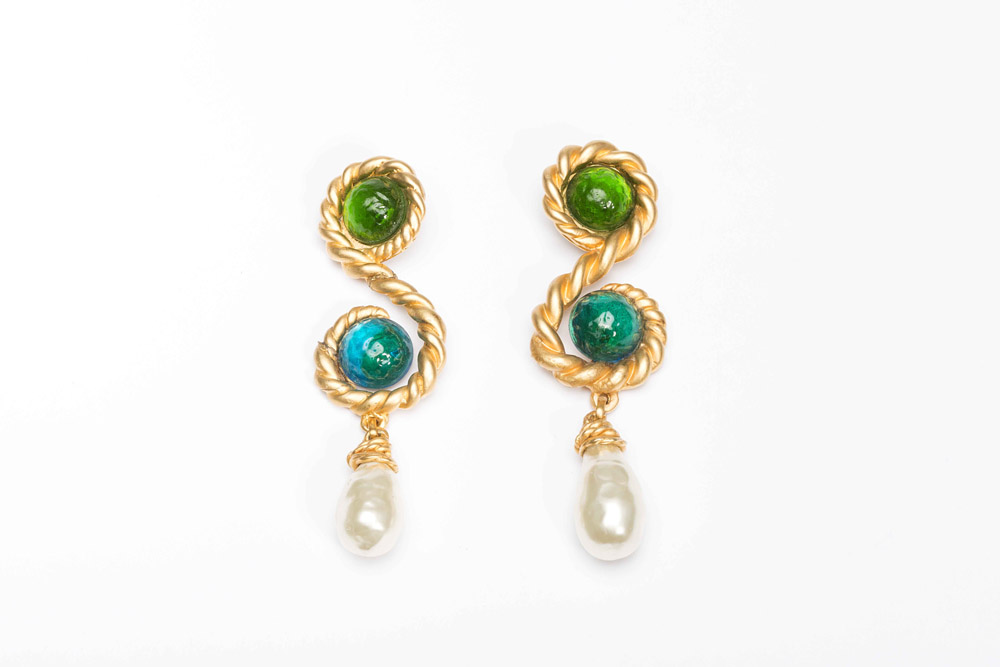 Chanel: orecchini pendenti con clips, in metallo color oro motivo a torchon con due paste vitree cabochon nei colori del verde, blu e perla fancy a goccia
