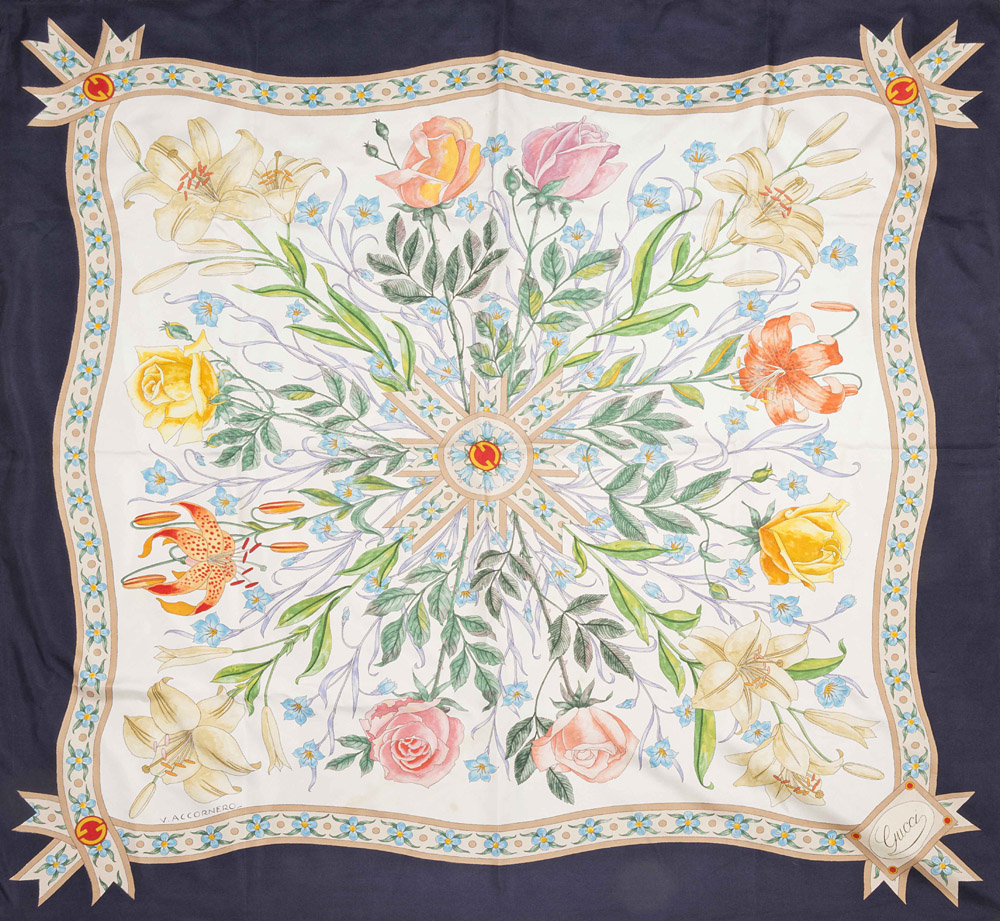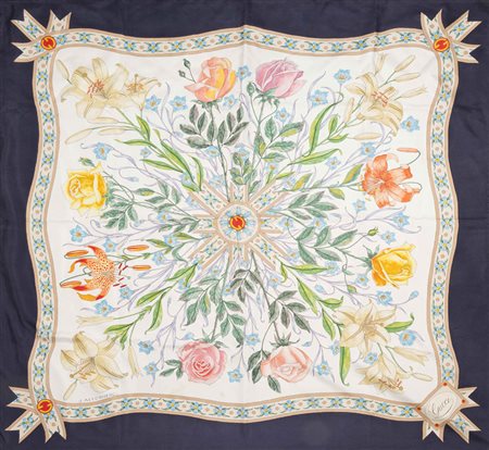 Gucci V. Accornero: foulard seta stampa Flora, bordo blu (difetti)
