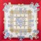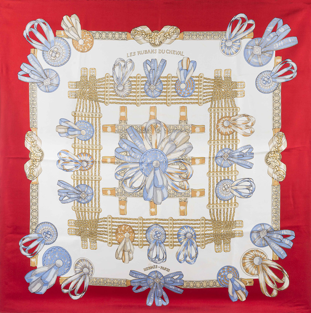Hermes Paris: foulard in seta stampa "Les Rubans du Cheval", toni azzurro e oro, su fondo bianco e bordo rosso, Joachim Metz, 1993