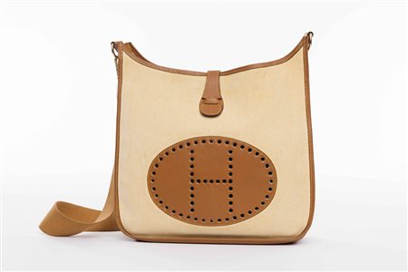 Hermes Paris: borsa Evelyne in cotone color beige e rifiniture in pelle color nocciola, dettagli in metallo dorato, largh. cm 32, in sacchetto originale
