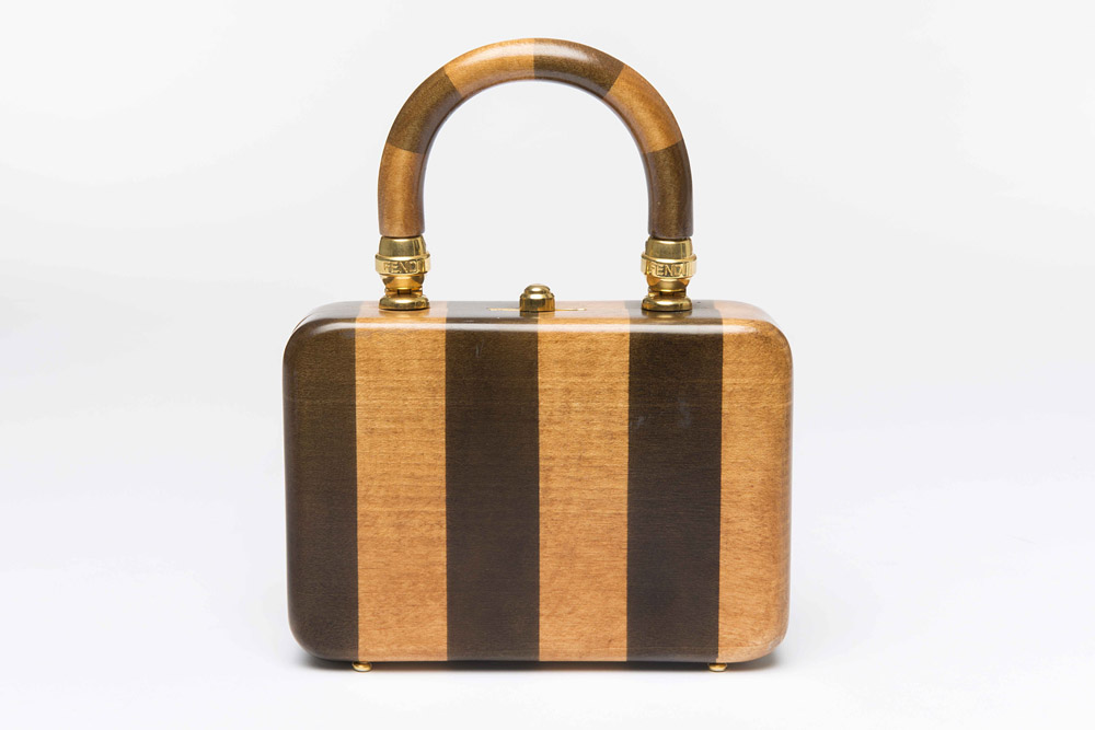 Fendi: borsina in legno motivo rigato con manico, rifiniture color oro, largh. cm 17 (lievi difetti)