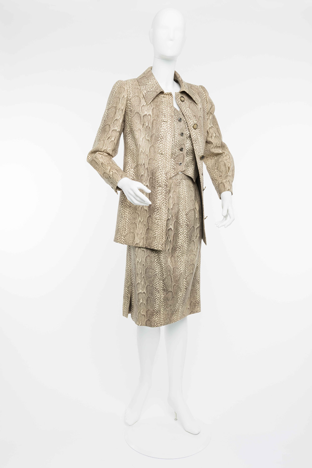 Valentino Couture: completo tre pezzi giacca, gilet e gonna in lana con stampa pitone sui toni del beige