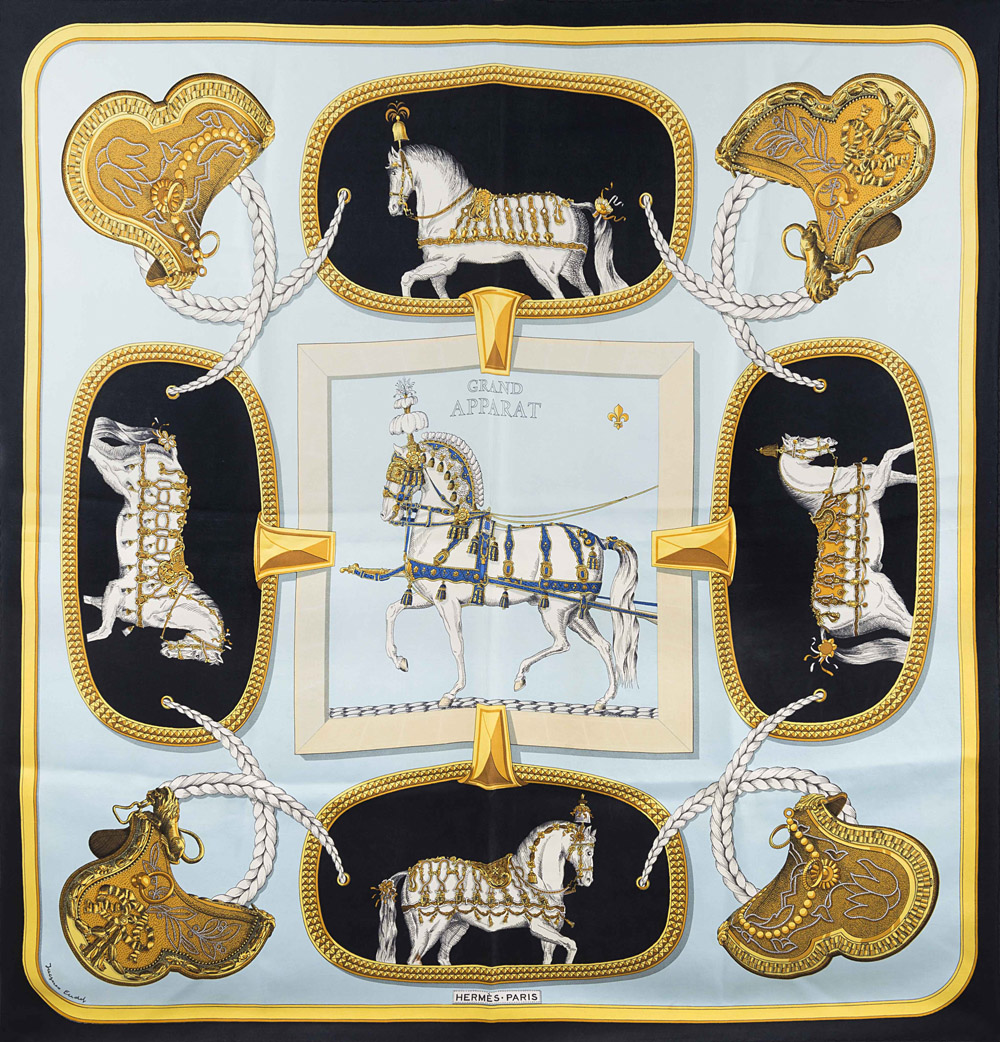 Hermes Paris: foulard in seta stampa "Grand Apparat" sui toni del celeste, oro e blu, bordo blu, Jacques Eudel, 1962