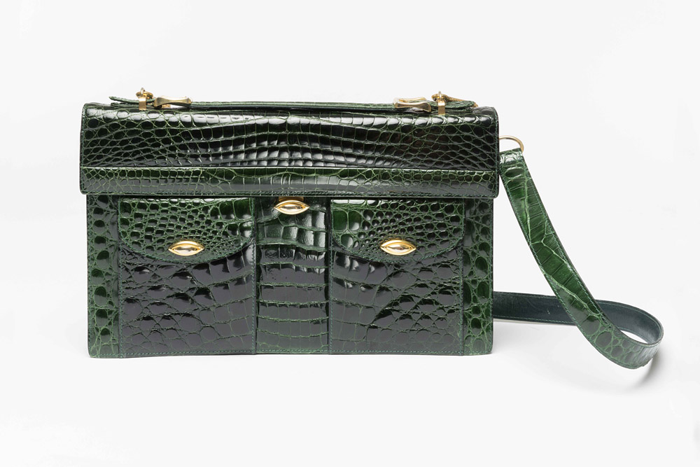 Attribuita a Valextra: borsa con due piccole tasche esterne in coccodrillo color smeraldo e tracolla removibile, largh. cm 30. Pre-Convenzione Cites