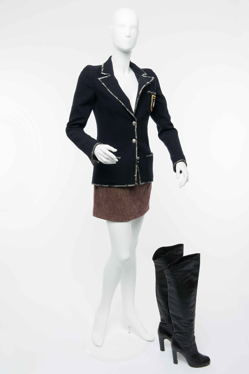 Chanel, Kristina Ti, Vicini: lotto composto da giacca Chanel in lana bouclè di colore blu con stemma e bottoni logati (tg 36 francese), gonna Kristina Ti in lana bouclè melange bordeaux e verde (tg 40), un paio di stivali in pelle nera Vicini con tacco (mis. 36 e 1/2)