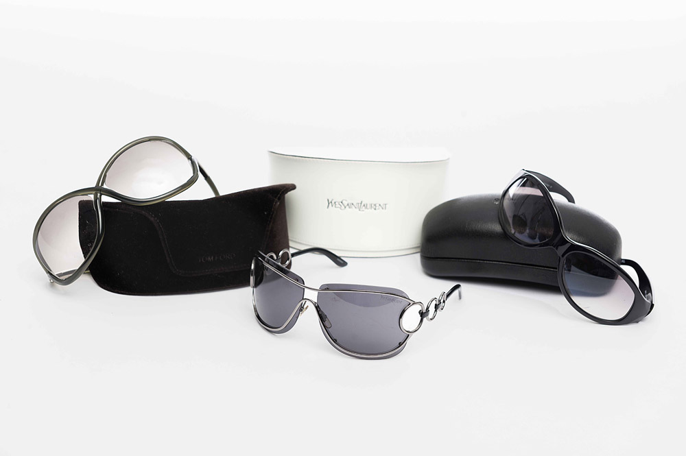 Yves Saint Laurent, Tom Ford, Costume National: lotto composto da tre paia di occhiali da sole, due sui toni del nero e uno del verde bottiglia con rifiniture color nickel, in custodie originali