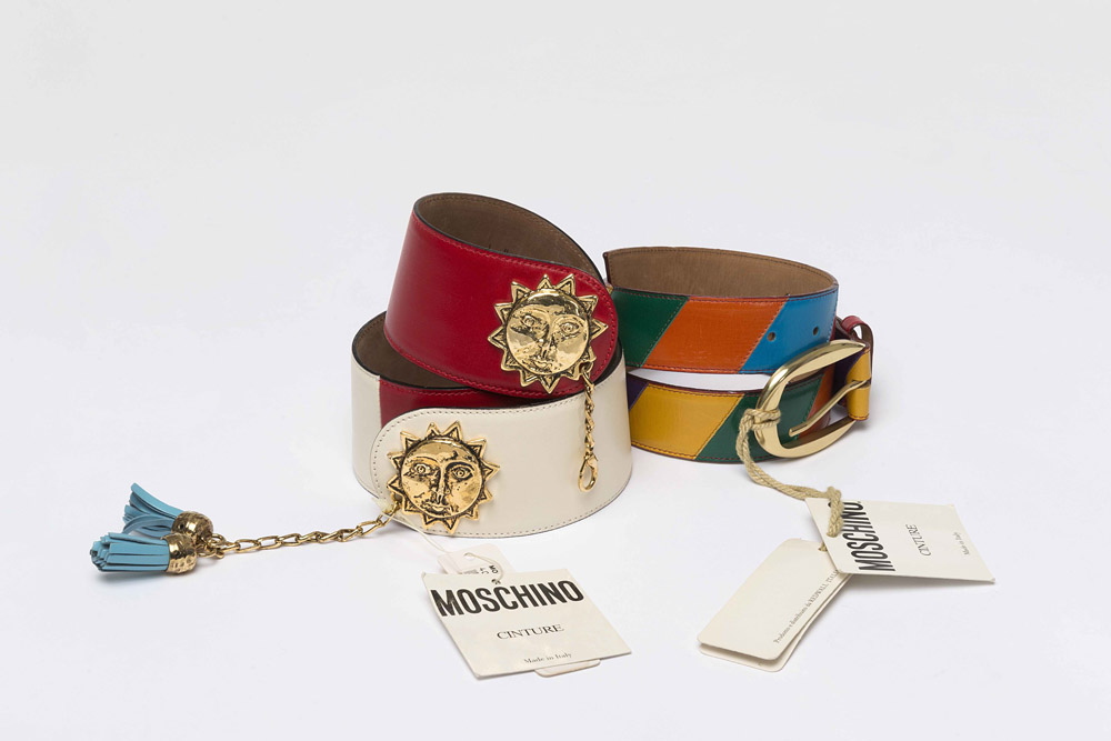 Moschino: lotto composto da due cinture in pelle una di colori vari e l'altra bianca e rossa con chiusura a catena tra due soli color oro, tg 42 (nuove)