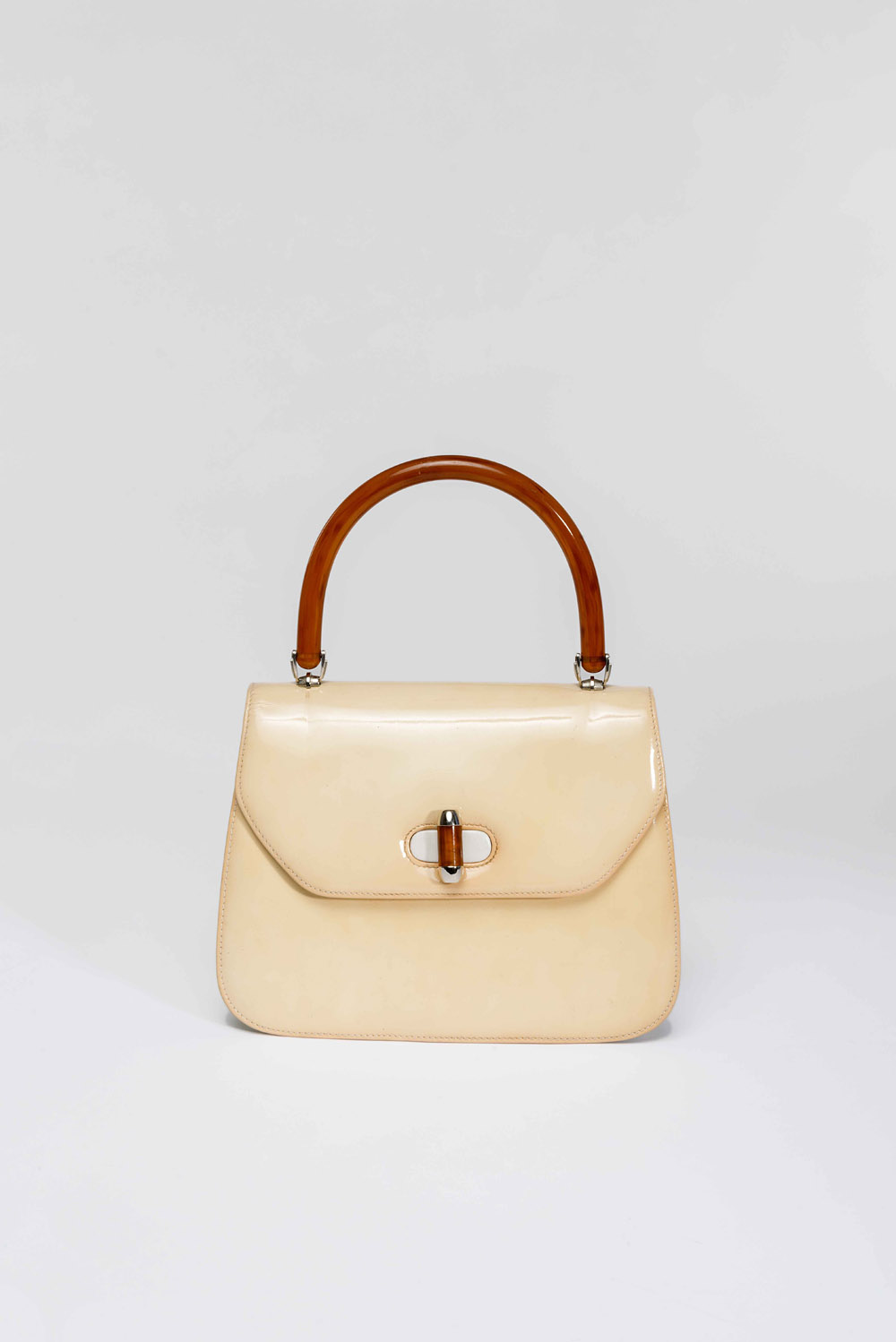 Gucci: borsa in pelle lucida color avorio con rifiniture in nickel, manico e chiusura in bachelite color ambra, largh. cm 22 (lievi difetti)