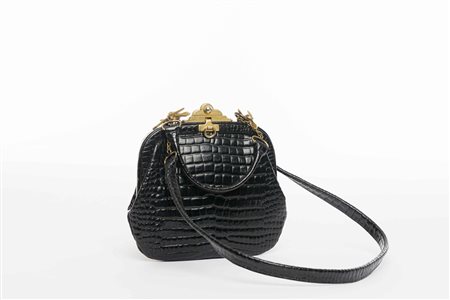 Roberta di Camerino: piccola borsa in pelle stampata con tracolla e manico rimovibili, chiusura sagomata in metallo dorato, largh. cm 19 (lievi difetti)