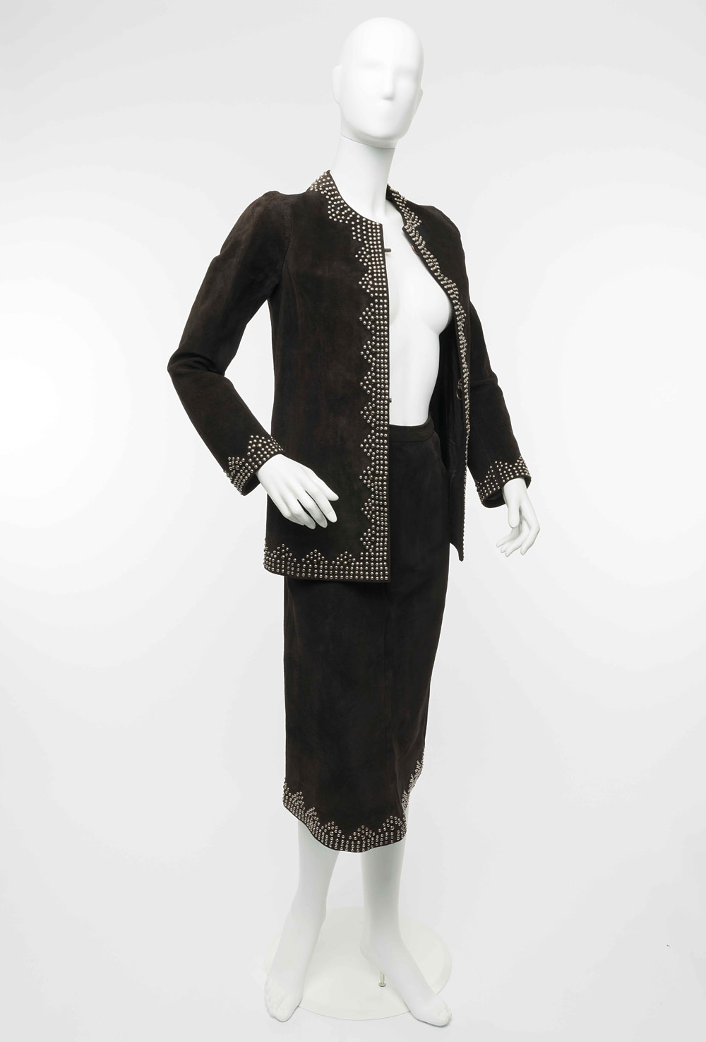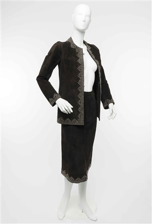 Yves Saint Laurent Paris: completo gonna scamosciato color testa di moro, con bordature in borchie color nickel (lievi difetti)