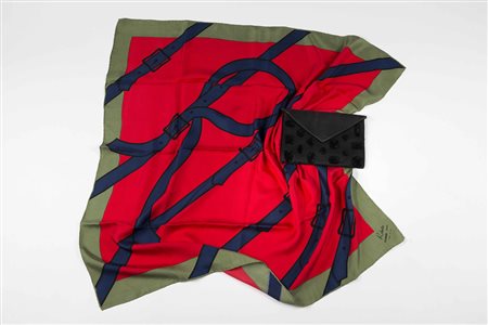 Roberta di Camerino: lotto composto da una pochette a busta in tessuto nero con gemme in velluto a rilievo, largh. cm 22, ed un foulard in seta stampa "cinture" color rosso, blu e verde