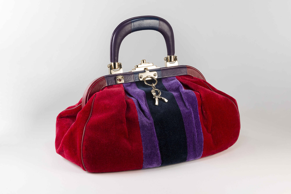 Roberta di Camerino: borsa Bagonghi in velluto rigato e manico in pelle sui toni del rosso, del verde e del blu, largh. cm 35, in sacchetto originale Il ricavato della vendita di questo lotto sarà devoluto al Progetto della Nuova Casa Pediatrica, Ospedale Fatebenefratelli di Milano.