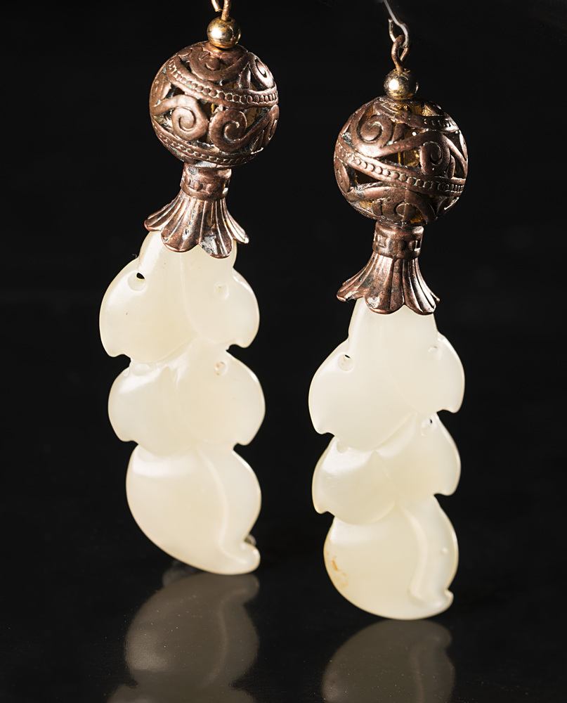 Orecchini con pendenti in giada color celadon a forma di piccole foglie e montatura in metallo lavorato Cina, sec. XX A pair of earrings with celadon jade pendants shaped as leaves, with pierced metal mounts China, 20th century (l. 10 cm.)