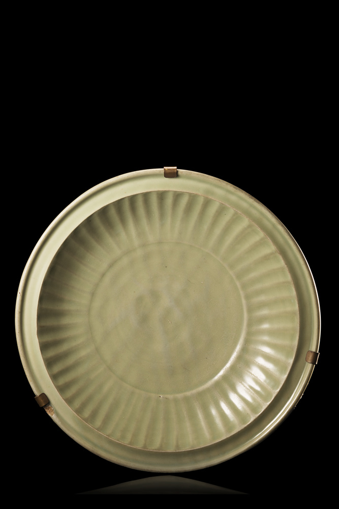 Piatto in grès a invetriatura celadon con decorazione impressa nel cavetto Cina, secc. XIV-XV A celadon dish. China, 14th/15th century (diam. 32,8 cm.)