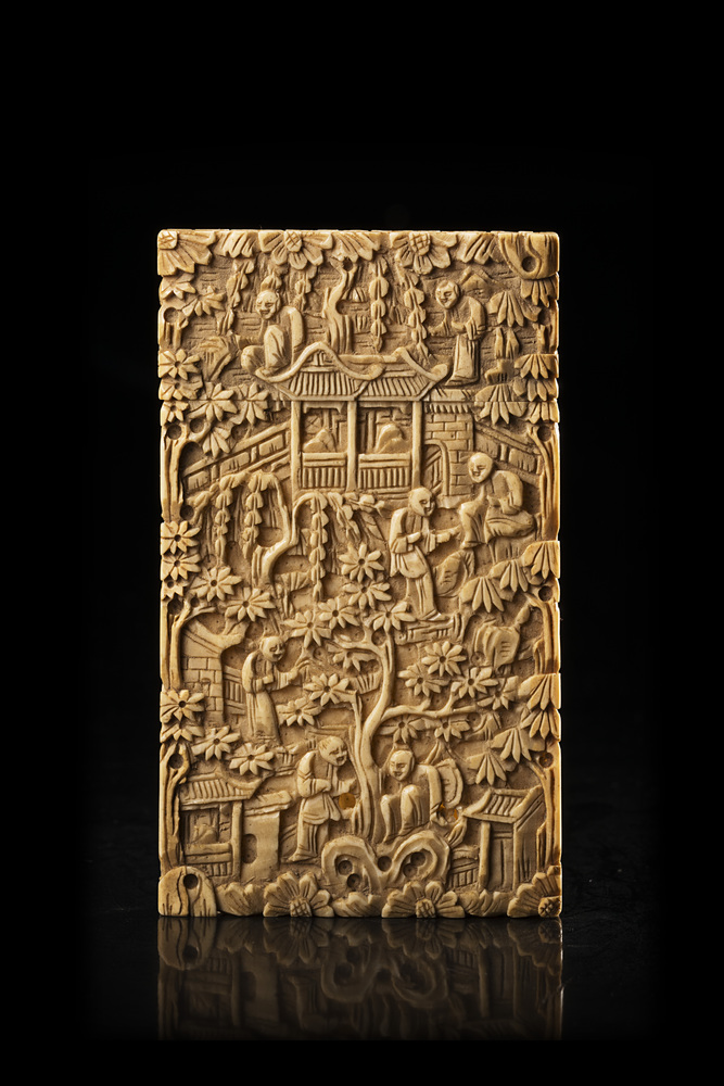 Portabiglietti da visita in avorio intagliato con figure in un paesaggio con pagode Cina, seconda metà sec. XIX A carved ivory card holder, decorated with figures in a landscape with pagodas China, second half of the 19th century (9,5x5,5 cm.)