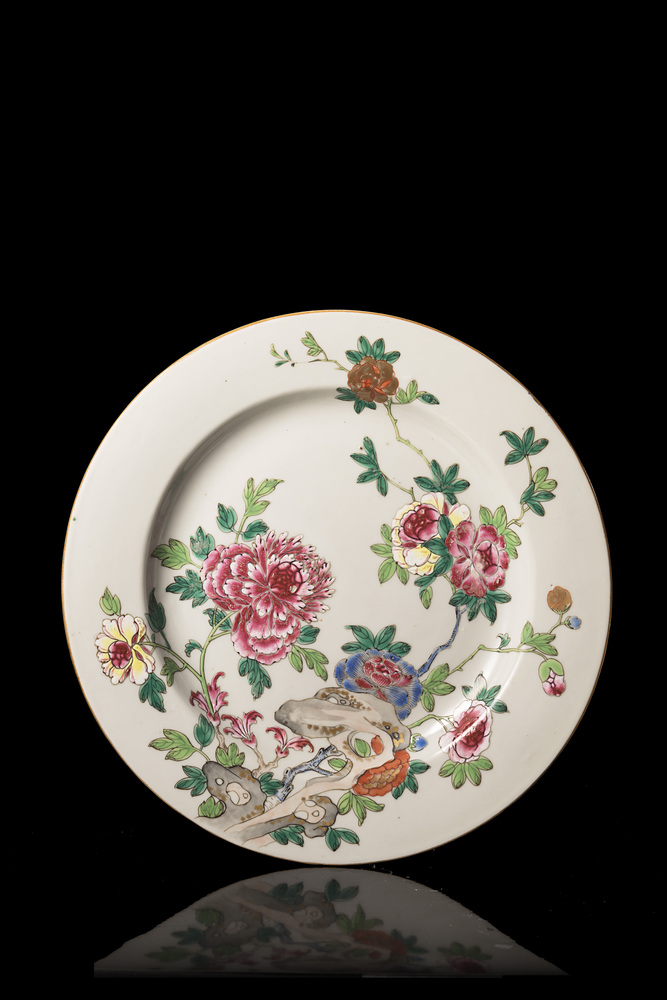 Tre piatti Famiglia Rosa decorati con rami di peonia in fiore tra rocce ornamentali, doratura al bordo Cina, seconda metà sec. XVIII Three Famille Rose dishes decorated with flowering peony branches and pierced rocks, gilt borders China, second half of the 18th century (diam. 23 cm.)