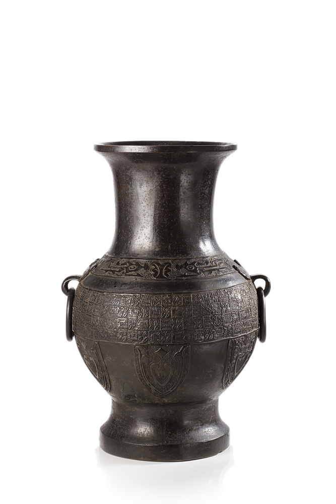 Vaso in bronzo dalla forma arcaica con decorazione geometrica stilizzata e anelle in sospensione Cina, dinastia Ming (1368-1644) A bronze vase of archaic form, with a band of geometric motifs, with suspended rings China, Ming dynasty (1368-1644) (h. 36 cm.)