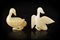 Coppia di ornamenti per cappello in giada color celadon, raffiguranti due anatre, una in volo, una stante, la pietra con naturali inclusioni e venature color ruggine, ciascuna con buchi sul retro Cina, sec. XIX A pair of small jade hat ornaments, depicting two geese, one in flight one standing, the stone with natural flaw lines and russet inclusions, each with pierced holes to the base China, 19th century (l. 3,5 cm.)