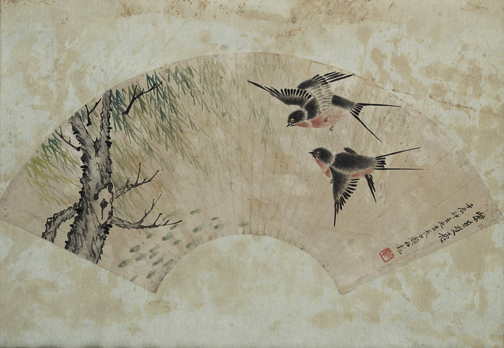 Due dipinti su fogli di ventaglio raffiguranti uccelli e rami fioriti, con iscrizioni e sigillio dell'artista, inchiostro e colore su carta (difetti), con montatura e cornice Cina, sec. XX Two fan paintings depicting birds and flowering branches, with inscription and artist's seal, ink and colours on silk (losses), mounted and framed China, 20th century (l. 53 cm. approx.)