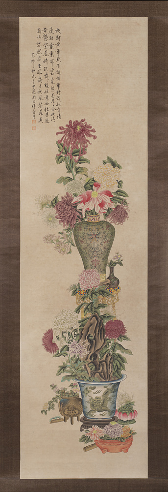 Dipinto raffigurante vasi e bronzi arcaici adornati da fiori, tra cui peonie e crisantemi, con iscrizioni e sigillio dell'artista, inchiostro e colore su carta Cina, fine sec. XIX-inizio sec. XX A vertical scroll depicting porcelain vases and archaic bronzes with flowers comprising peony and chrysanthemum, with inscription and artist's seal China, late 19th-early 20th century (160x44cm.)