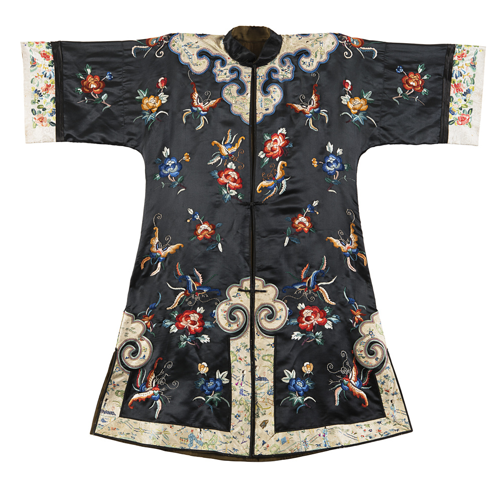 Veste in seta ricamata con farfalle e fiori su fondo nero, bordato con ricami sagomati su fondo beige (alcune mancanze) Cina, inizi sec. XX A silk robe embroidered with butterflies and flowers on a black ground, bordered with shaped panels of a beige tone (some losses) China, early 20th century (107x117 cm. approx.)