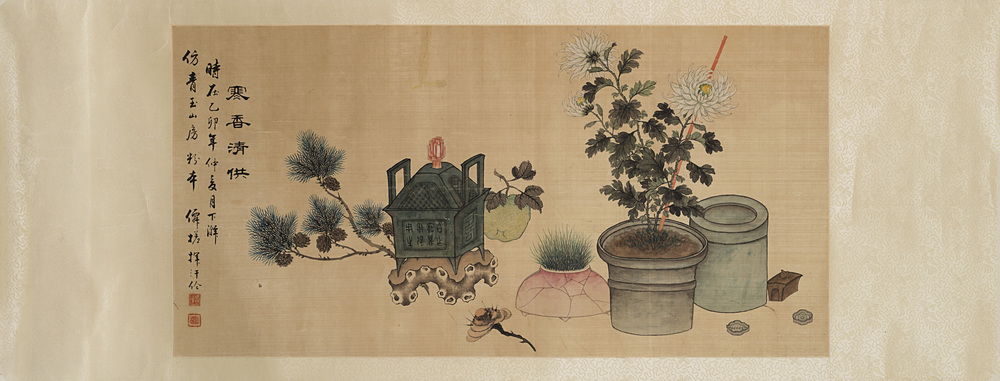 Dipinto su scroll orizzontale decorato con un incensiere in bronzo in stile arcaico, fangding, e alcune piante in vaso, con iscrizioni e sigillo. Inchiostro e colore su carta, montato su seta. Cina, sec. XIX A horizontal scroll depicting an archaic bronze censer, fangding, and some potted plants, with inscriptions and seals. Ink and colours on paper, with silk mount. China, 19th century (99x50 cm.)