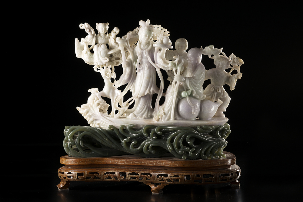 Gruppo scultoreo in giadeite composto da Shoulao e Xi Wangmu su una zattera con fanciulli e animali, contornati da rami in fiore poggiante su base in giada verde decorata con onde, con base in legno Cina, sec. XX A jadeite group of Shoulao and Xi Wangmu with boys and animals standing on a raft embellished with flowering trees, supported by a green jade base decorated with waves, with wood base China, 20th century (h. 27 cm.)