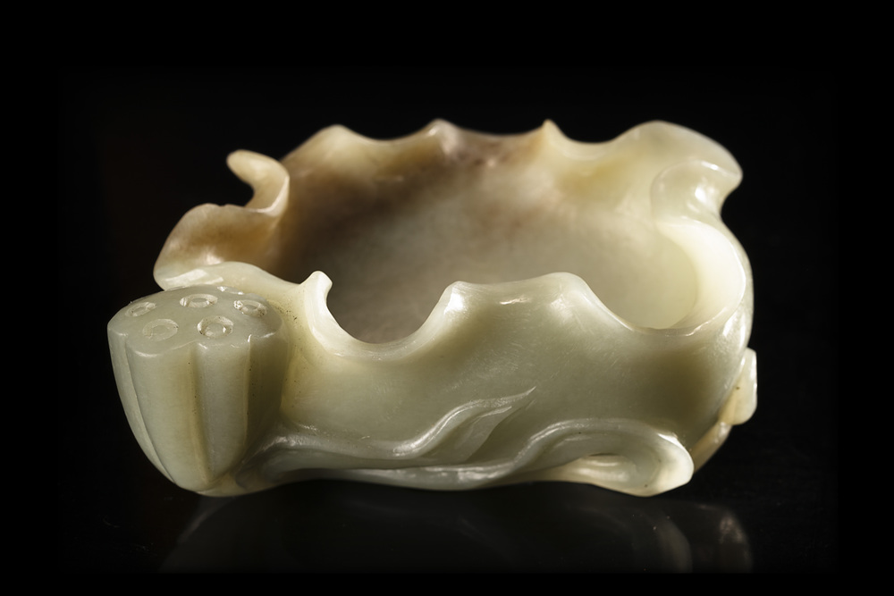 Lavapennelli in giada color celadon, a forma di foglia di loto, con boccio a lato e steli sul fondo, la pietra con alcune inclusioni color ruggine Cina, fine sec. XIX-inizio sec. XX A celadon and russet jade brush washer shaped as a lotus leaf, with a small bud to one side, the stems on the bottom China, late 19th-early 20th century (l. 10,5 cm.)