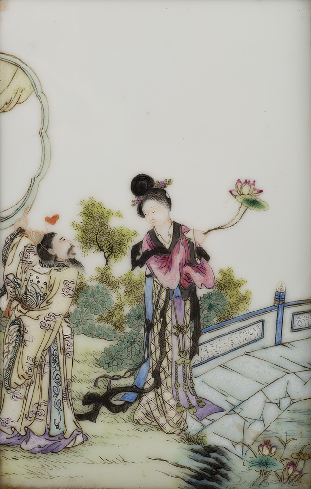 Due placche di porcellana, di forma rettangolare, una decorata con una dama con fiore di loto e lunghe vesti accompagnata da un saggio in un giardino fiorito, l'altra con un fanciullo e un gentiluomo appoggiato ad uno steccato in un giardino di rocce e bambù; montate in cornici di legno e radica. Cina, periodo della Repubblica (1912-1949) Two rectangular porcelain plaques, one enamelled with a lady wearing long robes and carrying a lotus accompanied by a bearded gentleman in a flower garden, the other decorated with a boy watering a bamboo with a bearded gentleman leaning against a fence, each mounted in a mixed wood frame China, Republic period (1912-1949) (17,5x11 cm.)