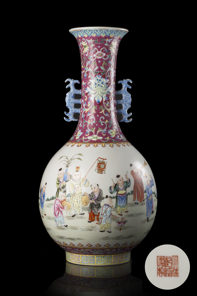 Vaso biansato a bottiglia in porcellana Famiglia Rosa, decorato con fanciulli in processione, il collo con motivi floreali su fondo color rubino, marchio apocrifo Qianlong Cina, periodo della Repubblica (1912-1949) A Famille Rose bottle vase with twin handles decorated with boys in procession, the neck with scrolling lotus on a ruby ground China, Republic period (1912-1949) (h. 42 cm.)