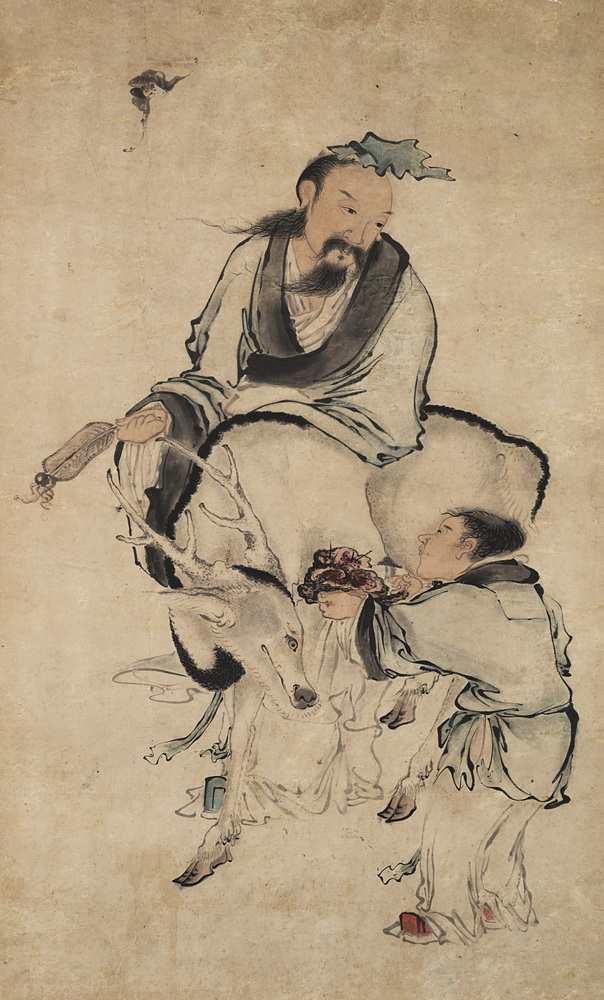 Dipinto su scroll verticale con Immortale Taoista Zhongli Quan accompagnato da un cervo e da un fanciullo. Inchiostro e colore su carta. Cina, fine sec. XIX-inizio sec. XX A vertical scroll depicting the Daoist Immortal Zhongli Quan accompanied by a deer and a boy attendant. Ink and colours on paper. China, late 19th-early 20th century (113x80 cm.)