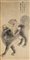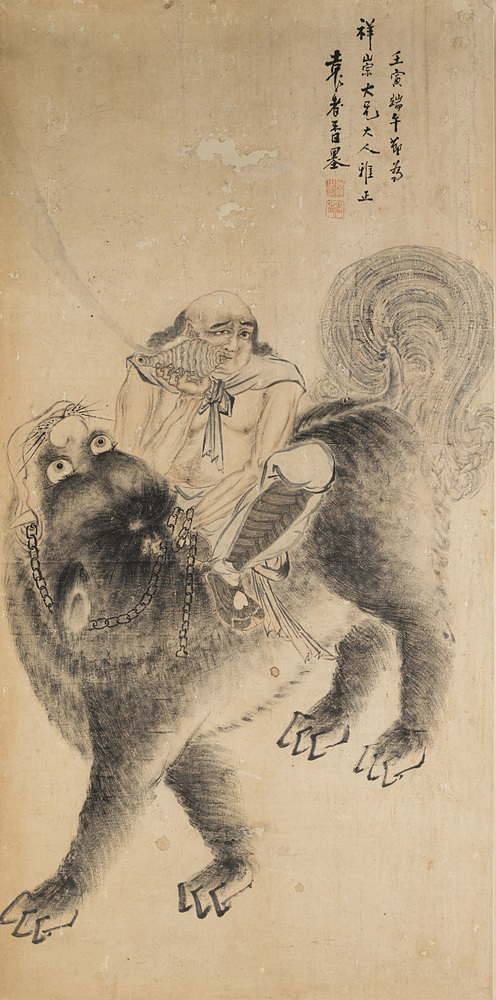 Dipinto raffigurante un luohan con una conchiglia, a cavallo di un leone, con iscrizioni e sigillo. Inchiostro su carta. Cina, sec. XIX A painting of a luohan holding a conch shell and riding a lion, with inscriptions and seals. Ink on paper. China, 19th century (178x88 cm.)