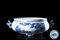 Incensiere tripode in porcellana bianca e blu, il corpo schiacciato decorato...