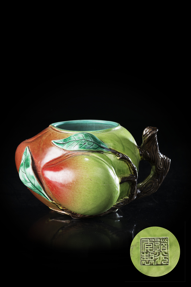 Lavapennelli in porcellana policroma a forma di pesca, composto da due frutti e ramo modellato naturalisticamente con foglie, interno turchese, marchio apocrifo Daoguang alla base Cina, sec. XX A polychrome "peach" brushwasher, composed by two conjoined fruits on a leafy gnarled branch, the interiore turquoise, apocryphal Daoguang mark to the base China, 20th century (h. 15 cm.)
