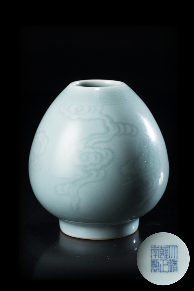 Piccolo vaso per acqua con invetriatura claire-de-lune, decorato con delicate incisioni di nuvole e lingzhi, marchio apocrifo Yongzheng Cina, sec. XX A small claire-de-lune waterpot with delicately incised with clouds and lingzhi, with apocryphal Yongzheng mark China, 20th century (h. max. 8,5 cm.)