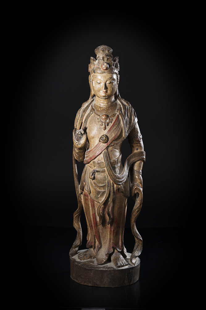 Statua lignea raffigurante Guanyin stante, con elaborata acconciatura e lunghe vesti, tracce di policromia, con base Cina, dinastia Ming (1368-1644) A wood model of a standing Guanyin, wearing long robes, traces of colour, with stand China, Mign dynasty (1368-1644) (h. 57 cm.)