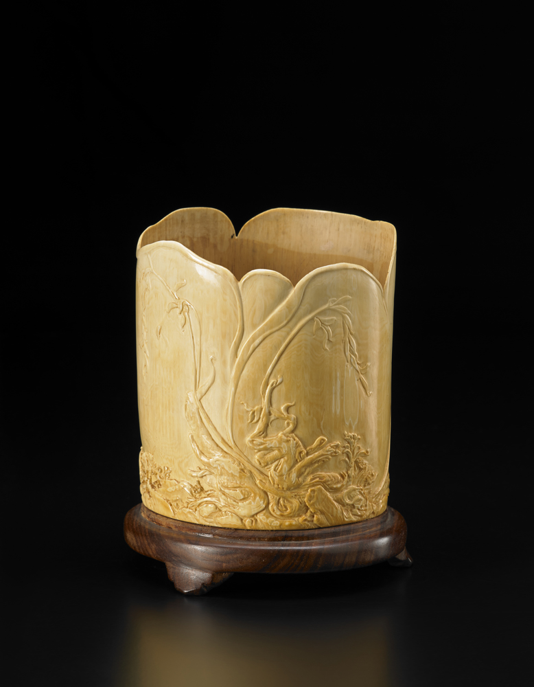 Portapennelli in avorio, con bordo a forma di petali, adornato all'esterno con delicata decorazione in rilievo di rami in fiore tra rocce ornamentali, base in legno Giappone, sec. XIX An ivory brushpot, with a petal-shaped rim, delicately incised to the exterior with flowers amongst rocks, wood base Japan, 19th century (h. 13 cm.)
