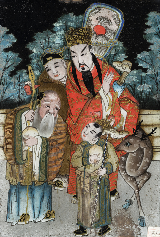 Un verre paint raffigurante Shoulao e altri Immortali accompagnati da fanciullo e cervo, con cornice Cina, sec. XX A reverse glass painting of Shoulao and Immortals accompanied by a boy attendant and a deer, with frame China, 20th century (49x34 cm.)