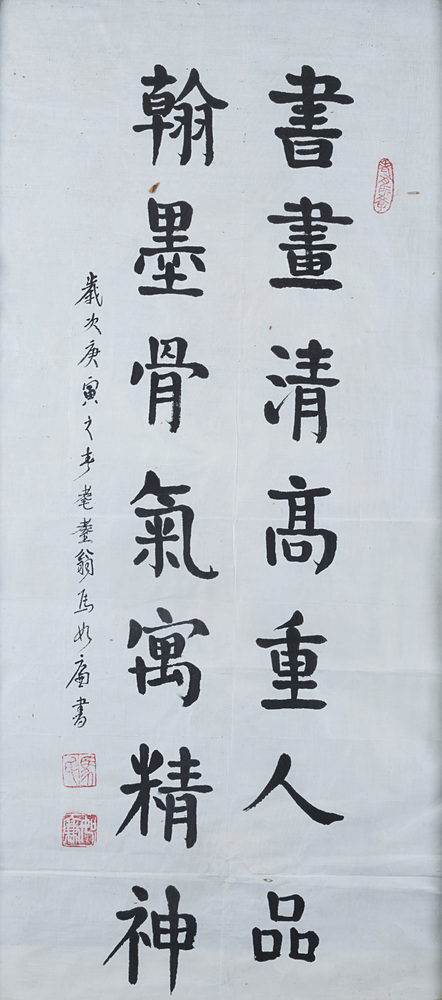 Dipinto con calligrafia cinese, inchiostro su carta, montato e incorniciato (difetti) A painting with Chinese calligraphy, ink on paper (losses) (77x43 cm.)