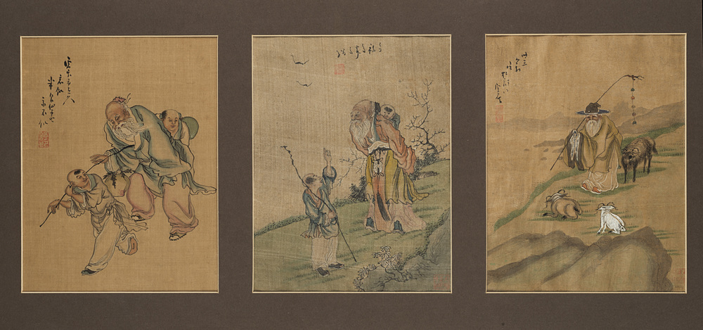 Tre dipinti raffiguranti un Immortale con servitori in scene di paesaggio, con iscrizioni e sigilli. Inchiostro e colore su seta, montati e incorniciati. Cina, sec. XX Three paintings depictign an elderly Immortal with attendants in landscape scenese, with inscriptions and seals. Ink and colours on silk, mounted and framed. China, 20th century (22x17 cm.)