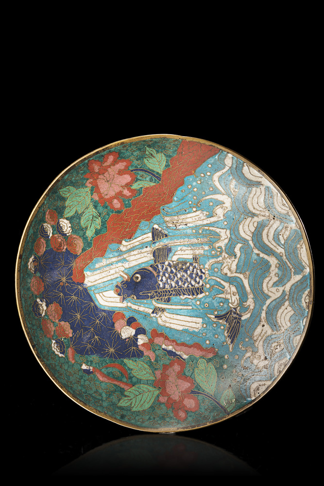 Piatto in metallo cloisonnè decorato con una carpa che emerge tra i flutti, contornata da fiori Cina, sec. XX A cloisonnè enamel dish decorated with a carp emerging from the waves, surrounded by flowers China, 20th century (diam. 22 cm.)