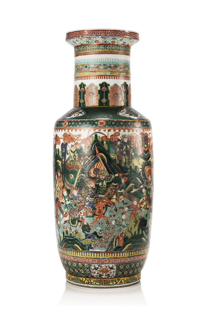 Grande vaso rouleau in smalti Famiglia Verde decorato con scene di battaglia di guerrieri armati e a cavallo (difetti e ripari) Cina, sec. XIX A large rouleau Famille Verte vase decorated with armed warriors on horses engaged in battles (losses and repairs) China, 19th century (h. 90 cm.)