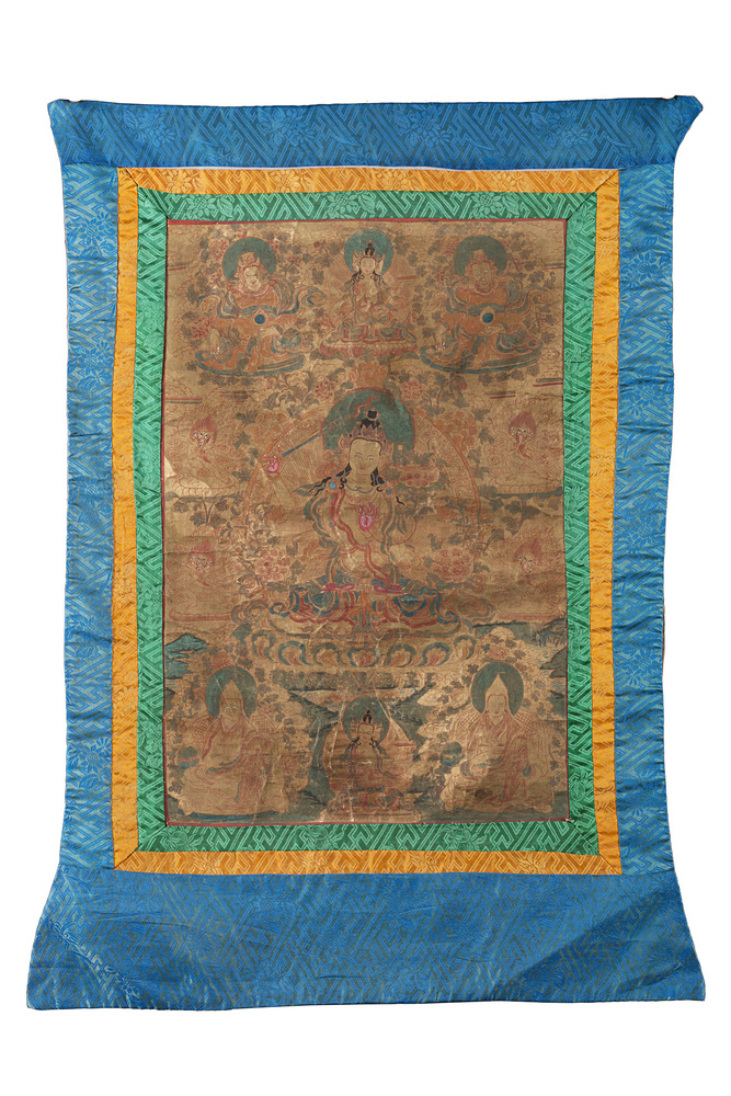 Un thangka fondo oro raffigurante Tara con fiore di loto e spada, circondata da altre divinità, colori su tela (lievi difetti) Cina/Tibet, fine sec. XIX-inizio sec. XX A gilt ground thangka depicting Tara surrounded by deities, colours on cloth (minor losses) China/Tibet, late 19th-early 20th century (71x48 cm.)