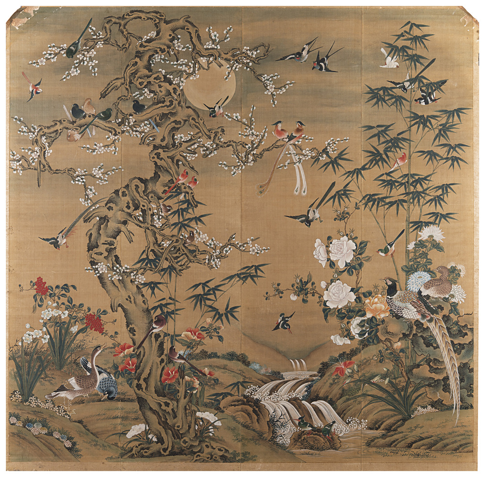 Pannello decorato con dipinti cinesi raffiguranti coppie di anatre mandarine e altri uccelli in un paesaggio con alberi e fiume, inchiostro e colore su seta, applicato su supporto (difetti e mancanze) China, prima metà sec. XX A panel decorated with Chinese paintings portraying a couple of mandarin ducks and other birds in a landscape scene with trees and a river, ink and colours on silk, mounted (losses and flaws) China, first half of the 20th century (157x162 cm.)