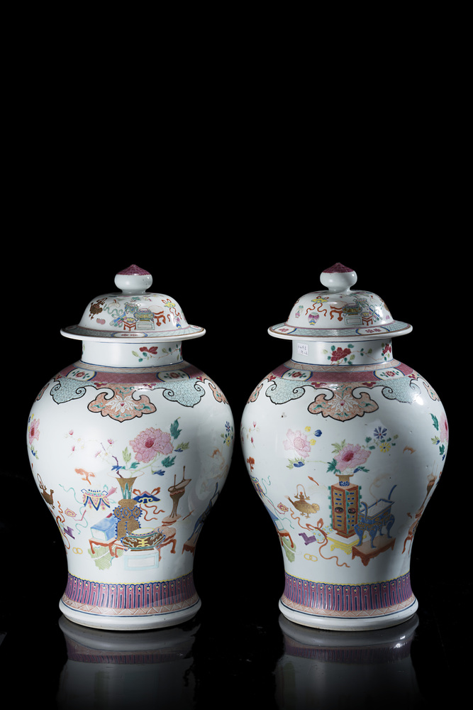 Coppia di vasi a balaustro in porcellana con coperchio, decorati in Famiglia Rosa e doratura con oggetti preziosi e fiori, sotto una ricca bordatura geometrica, il coperchio con pomello in fiore di loto (una sbeccatura sul coperchio; piccole mancanze agli smalti) Cina, sec. XVIII A pair of Famille Rose baluster vases and covers, each decorated in gilt and enamels with precious objects and flowers below a rich lappet border, each cover with lotus-shaped finial (one section to one cover missing, minor losses to the enamels) China, 18th century (h. 43 cm.)