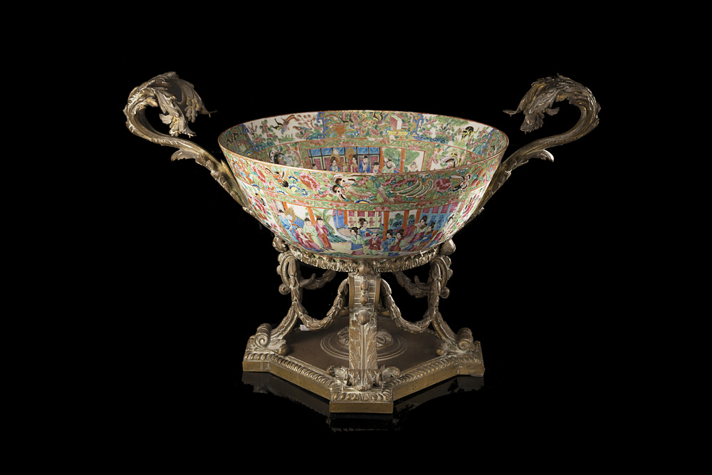 Grande ciotola in porcellana Famiglia Rosa cantonese, decorata con smalti e doratura con figure in scene di interni e ricco sfondo floreale (alcune mancanze), con base in bronzo dorato La porcellana, Cina, sec. XIX Provenienza: Sotheby's Milano, 8 Giugno 1999, lotto 69 A large Cantonese Famille Rose bowl decorated in gilt and enamels with figures in interior scenes on a rich floral ground (some losses), with an ormolu base The porcelain, China, 19th century Provenance: Sotheby's Milan, 8 June 1999, lot 69 (diam. 41 cm.)