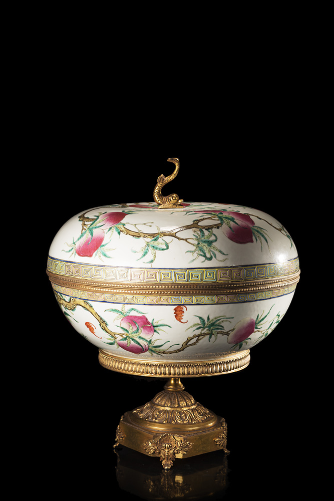 Grande scatola con coperchio di forma circolare decorata in Famiglia Rosa con il motivo beneaugurante delle "Nove pesche", con montatura in bronzo dorato (difetti) Cina, fine sec. XIX/inizio sec. XX A large Famille Rose circular box decorated with the auspicious motif of the "Nine peaches", with bronze mounts (some losses and flaws) China, late 19th/early 20th century (diam. 33 cm.)