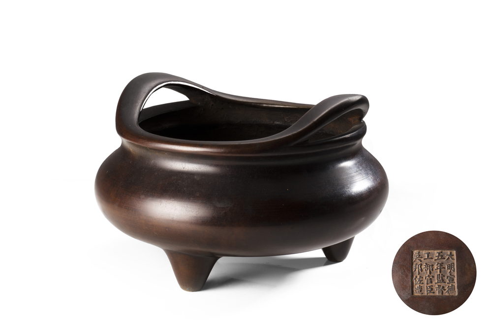 Incensiere tripode in bronzo, il corpo globulare con doppie anse e marchio apocrifo Xuande alla base "Daming Xuande Wunian Jiandugongbu Guancheng Wu Bangzuo Zao", buona patina Cina, tardo sec. XVIII Provenienza: una collezione privata lombarda, acquisito a metà del XX secolo A bronze tripod censer with loop handles, the body of compressed globular form, an apocryphal Xuande mark to the base reading "Daming Xuande Wunian Jiandugongbu Guancheng Wu Bangzuo Zao" China, late 18th century Provenance: a Lombard private collection, acquired mid-20th century (diam. 18 cm.)